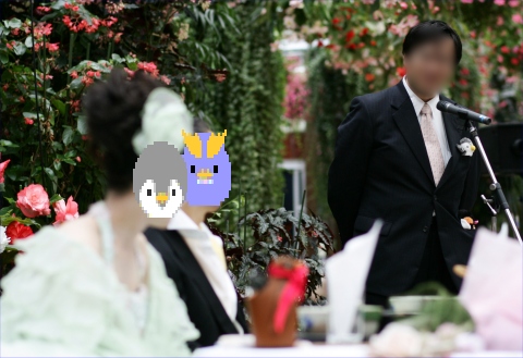 | (司会) 『それでは、本日、結びのご祝辞をいただきたいと思います。新郎新婦、共通のお知り合いでいらっしゃいます、O様にお願いいたします。O様は、新郎新婦の二人が出会うきっかけとなった、ペンギンアート展の創始者でいらっしゃいます。それではO様、よろしくお願いいたします』 | |