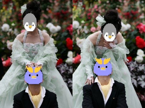 | (司会) 『それでは引き続き、ご来賓の方より、ご祝辞をいただきたいと思います。新郎新婦、共通のご友人でいらっしゃいます、K様にお願いいたします。K様は、名古屋港水族館にお勤めされておりまして、以前はペンギンの飼育員をなさっていました。新郎新婦のお二人が店番をしていたペンギンアート展を訪問されたことから、お二人との交流がはじまったとのことです。それではK様、よろしくお願いいたします』 | |