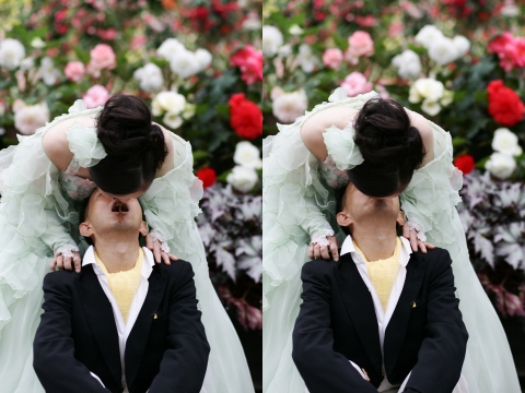 | 『最後にひとつちょっと……。エンペラーペンギンが実際にヒナの世話をしているところをですね、HARUNAさんたち二人に、演じていただこうかと思います。 じゃあHARUNAさんはヒナです。どうぞこちらへ』 (導かれて僕はふたたびテーブルの前に出て行く) 『HARUNAさん、しゃがんでください。お母さん、早くしないと、ヒナが凍えて死んじゃうよ』 (あでりーも僕のそばにやってくる) 『あでりーさん、後ろに立ってください』 (あでりーが僕の後ろに立つ) 『はい、こんな感じです。こういう感じでエンペラーペンギンの親鳥は、ヒナを、正確には足の上に置いてちっちゃい間は育ててるんですね。じゃあですね、ヒナ鳥に餌をあげてもらいましょう』 (そう言い残して、Kさんは僕らの席のほうに移動し、僕らの食事からきんぴらごぼうのお皿とお箸を持ってきた。僕はこの時点で、これからおこなわれることの概略が予想できた) 『えー、南極の魚は仕入れて来られなかったので、今日はきんぴらで。餌はですね、お母さんが海で、本当は魚を獲ってくるんですね。それをおなかの中にたくさんたくわえて、口移しで、与えます』 (ここでようやくKさんのたくらみが明かされる。あでりーは口をあんぐりと開けていた。てっきりお箸で与えるものと思っていたようだ。 『それではまず、お母さんのほうに餌をくわえていただきましょう』 (あでりーが何か小声でしゃべっている。箸じゃだめですか、と頼んでいるようだ) 『箸じゃだめですかって言われてるんですけど……』 (会場から、「ペンギンは箸は使いませ〜ん」の声が上がる) 『ペンギンは箸を使えないんですけど、あのー、箸は使わないほうがいいなと思われる方は拍手を』 (万雷の拍手。あでりーはこれで観念し、しぶしぶきんぴらを口にくわえる。後ろに立ったあでりーがしゃがみ、僕の顔の前にくわえた“餌”を差し出す。「がんばれー」という声、そして失笑。僕は厳しい体勢ながらそれを口移しで受け取った。拍手と笑い声がわき起こる) 『えー、このようにして、親子の絆、夫婦の絆は深まっていくんですね。HARUNAさん、あでりーさん、今日は本当におめでとうございました』 |