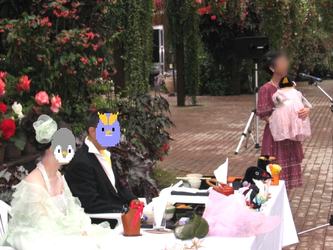 | 『ペンギンアート展の創始者という大きな言い方をして頂いたんですが……、ペンギンアート展実行委員会の代表という、大きな名前を頂いております。 まずはじめにお会いしたのはあでりーさんのほうでした。ペンギンアート展というのは芦屋で、初めは本当に小さな小さなかたちで、二組の夫婦が発案したというか、そういうかたちで始まったわけですが、二回目の時だったかに、まだ本当に私たちの周りの人しか知らないような時期に初めて、遠くのほうからいらっしてくださった初めてのお客様でした。私はもうそんな芦屋の地に遠く岡崎から来てくれるなんて思いもしませんでしたので、この時はほんとうに喜んで、すごく嬉しかったです。 ペンギンアート展というのは、あそこのテーブルの人はよくわかっていますが(ペンギン仲間のテーブルを指さす)、たぶんその他の人にとっては、ちょっと変わっているっていうかあまり想像ができないと思います。ペンギンをテーマにした文化祭という形で、いろんな方がいろんなものを作って出すという一風変わった展覧会です。そういうものを見に来て下さるかたがいるんだろうかというのが、はじめの私たちの疑問だったんです。そこで、遠くから、お仕事をお休みして来て下さった初めてのお客様があでりーさんでした。それから本当にペンギンのことでいろいろ話が弾んで、長い間、話をしました。 HARUNAさんのほうは、それから少したってから、「ペンガホリック」というペンギンの好きな人のサイトが主催するオフ会がありまして、そこで初めてお会いしました。初めはとってもおとなしい、物静かな、静かに物を考えて沈着に行動なさるという、そんな印象の方でした。楽しくペンギンの話などをさせて頂きました。 そんなお二人が、そのあとでペンギンアート展の名古屋展というのを二人で一緒になさるということになりまして、まさかそれがこういうことになろうとは、そのときはたぶんご本人たちも思っていなかったかもしれませんが、私もそこまでは考えておりませんでした。ちょうど名古屋展の初日に、先ほどのKさんの行かれたのと同じ日に私も参りました。お二人が初日の大変なところで、すったもんだをしておられました。とってもお忙しく、いろんな準備をやっておられました。その時にお二人が忙しく立ち働いているところを拝見したんですが、その時にもうすでに共同作業を始めておられたわけで、ちゃんと準備は整っていたのだと思います。その時、初めてお会いされたと聞いたんですが、お二人でペンギンアート展のいろいろな作業を一緒にしておられる姿は、初めて会った二人とは思えなくて、本当にうまくやっておられたのを覚えております。それがきっかけでお付き合いをなさっているというのを後から聞きまして、びっくりしたんですけど、ああなるほどなあというか、あまり意外ではなかったわけです。今日はこんな形でお招きいただいて、本当に感激いたしております。本当にありがとうございます。 ペンギンが好きな人に悪い人はいないと私は思うんですけれども、そういう簡単なことではなくって、ペンギンがかわいいから好きだよっていうだけではなく、ペンギンが好きな人、とくにお二人のような形で親しくなられた人は、何か生き方というか、ただ趣味が同じというだけではなくて、ペンギンを通して生き方までも同じような方向に向かっていくっていうようなことを感じます。ペンギンが暮らしやすいところっていうのは、人間にとっても暮らしやすい、ペンギンがいていいなっていう雰囲気のところは、人間が暮らしていてもすごくいい雰囲気で、楽しいところだなあという感じがします。ペンギンを見て環境のことがわかったり、平和の象徴としては鳩が言われていますが、私はどちらかというと平和の象徴としてはペンギンのほうがふさわしいんじゃないかと、そういう鳥だと私は思います。 どうぞ今、ペンギンを通してつながっておられるお気持ちそのままに、ずっといいご家庭を築いていかれることを願っております。ペンギンによって、より人間らしい、人間にとって一番大切なことだとかいいところがペンギンによってすごく教えられるというか、ペンギンを好きなことによって強調されてくるというか、そんな気がいたします。どうぞお幸せに、これからもペンギンと共に歩んでいただきたいと思います。どうもおめでとうございました。 |