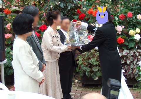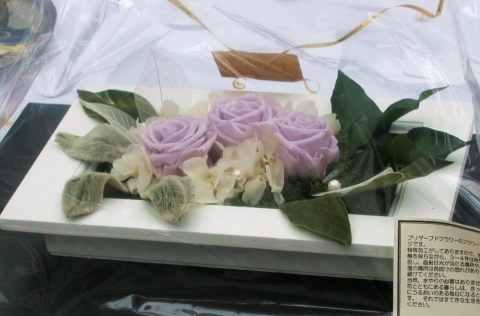 | 二人で作ったプリザーブドフラワーを一緒に持ち、お客様のほうへかかげて見せてから、僕の両親の前に歩み寄る。一礼をしてから、二人に手渡す。いったん戻ってもう一方の花を持ち、同じようにあでりーの両親に手渡した。 (6月にプリザーブドフラワーを製作した模様は、こちら) |