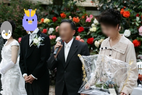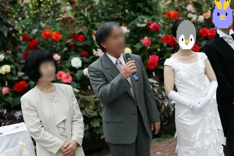 | (司会) 『ここで、ご両家のお父さまより、ごあいさつがございます。はじめにHARUNA家を代表いたしまして、HARUNAさんのお父さまでいらっしゃいます、M様にお願いをいたします』 | |