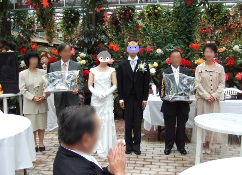 | (司会) 『どうぞ皆さま、今日ここに誕生いたしました、新しいご家族の絆にも、温かい祝福の拍手、お送り下さいませ』 | |