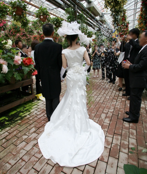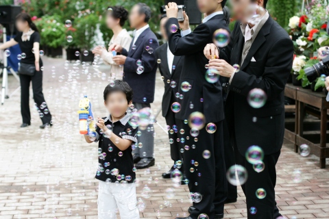 | (司会) 『それでは皆さま、新郎新婦、退席となります。皆さま方には、花道にご移動いただきまして、バブルシャワー、シャボン玉でお二人をお送りいただきたいと思います。係の者がご誘導いたしますので、どうぞ皆さま、花道のほうにご移動をお願いします』 | |