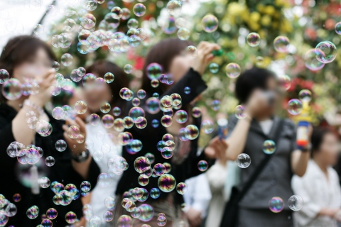 | お客様は全員、最初の入場時に通ってきた花道に移動する。スタッフの方が、手吹きのシャボン玉セットと、電池式のシャボン玉製造器をランダムに配ってくださった。準備が整ったのを見計らい、僕とあでりーは花道のほうへ歩いていき、メインステージ出入り口のあたりで立ち止まる。皆さんはすでにテストがわりにシャボン玉を吹いている。 | |