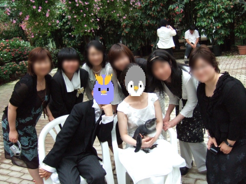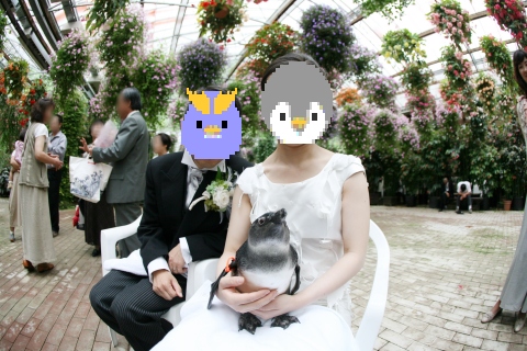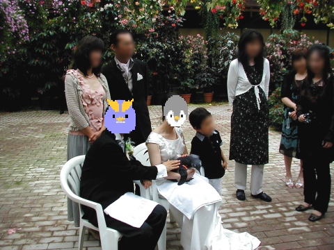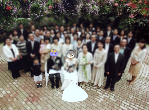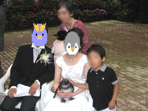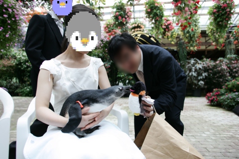 | お客様たちは記念撮影のため別のスペースに移動し、僕ら二人はいったん控え室に戻った。 あでりーがメイク直しをするかたわらで、僕はなんだか腑抜けのような状態になっていて、この時に何をしたのか、何を思ったのか、ほとんど覚えていない。 記念写真は、ひな壇に並ぶのではなく、全員が固まって立っているところを、脚立の上からカメラマンが撮影する形である。ひな壇を使うと手間がかかるし、既にお酒の入っている方などは危険でもある。そこで、打合せの結果、こうした形式を取ることにした。これはいい案だったと思う。 皆さんの待っているところへ、遅れて僕らも入っていった。やがてカメラマンの柿本さんの指示により、写真のための体系が組まれる。僕とあでりーだけは椅子に座り、ひざにペンギンを抱えての撮影となった。あでりーの抱えたペンギンは眠たいのかおとなしくしていたが、僕のほうのペンギンはけっこう暴れるので、支えているのが大変だった。何枚かを撮り、記念撮影は終了した。 |