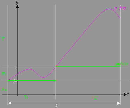 この定理は、以下のように設定された舞台上で成立する。 Step2:Rの部分集合をひとつきめて、Dと名づける。 Step3:Dを定義域とする「非負実数値1変数関数」y= f (x) つまり、 1変数関数「f:D→R」であって、 任意の x∈D⊂Rにたいして、f (x)≧0 を満たすもの を用意する。 y= f (x) は有界関数でなくてもよいので、 たとえば、(0,1 ]を定義域とするy= f (x)=1/xなどでもよい。 |