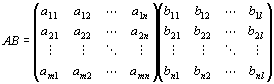 ・ 実行列の積ABが定義されるのは、〈Aの列の個数〉と〈Bの行の個数〉とが一致する場合だけ。〈Aの列の個数〉と〈Bの行の個数〉とが一致しない場合は、実行列の積ABは、考えない。 ・ (m,n)型行列Aと(n,l)型行列Bとの積ABは、次の(m,l)型行列として定義される。 ![]() つまり、 (m,n)型行列 と (n,l)型行列 との積ABとは、 あらゆる i行j列成分(AB)ij (i=1,2,…,m, j=1,2,…,l ) を、 ![]() =ai1b1j+ai2b2j+ai 3b3 j+…+ain bnj (ここでの和・積は実数体Rに定められている和積) によって定めた(m,l)型行列である。 ※要するに、積ABの i行j列成分(AB)ij (i=1,2,…,m, j=1,2,…,l, )は、 Aのi行とBのj列を取り出して、 n次元横ベクトルになっているAのi行(ai1,ai2,…,ain)と、 n次元縦ベクトルになっているBのj列 ![]() との積を計算したもの。 ・上記の定義は、多くの教科書で、次のように略記されている。 (m,n)型行列A=(aij), (n,l)型行列B=(bjk)にたいして、 AB=(cik) ただし、 |