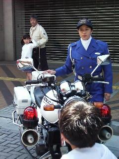 街のイベントで神奈川県警の婦人警官の白バイに子供が乗っているところです。この日は青空市場の日でした。七半(750cc)のバイクなので重量があり、倒れたりすればそれこそ大変なことになるのですが、子供にとっては夢中になるのもわかる気がします。私もパトカーには二度乗ったことがあります。学生時代に東京で一回、それ以後平塚へ帰ってきてからの都合二回です。以前から乗ってみたいと思っていたのです。警察官同乗でパトカーに乗る気分も悪いものではありません。何で乗せてもらえたのかはご想像にお任せしますが、少なくともイベントで乗せてもらったわけではなく、また私は凶悪犯罪の前科があるわけでもないことは確かです。白バイにも是非乗せてもらいたいと思うのですが、果たして私の夢は叶うのでしょうか?