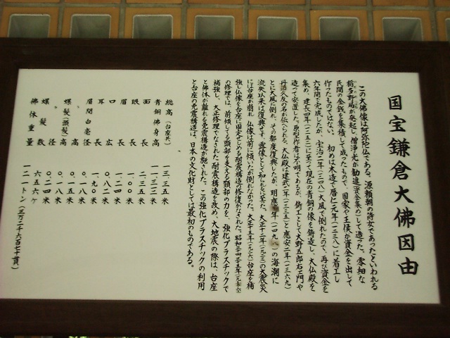 これは大仏さまが履くための特大の草鞋(わらじ)です。この草鞋の左側には鎌倉大仏由来記が掲げられています。以下の写真がそれです。