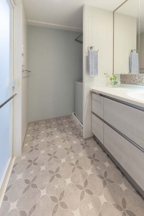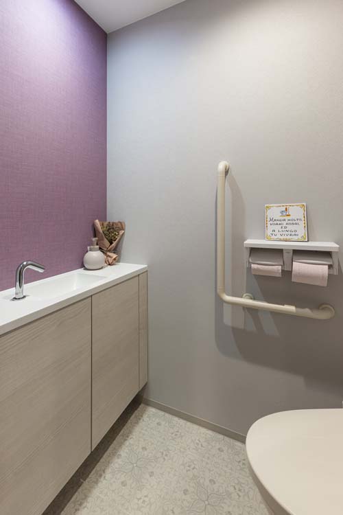 色を効かせたサニタリースペース・・・心と身体を癒す空間もリズミカルに