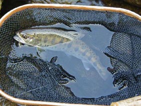 台風一過。釣り人にとっては願ってもないチャンスとばかり、餌釣りのおっちゃんがすでに陣取っている。台風で川底が洗われ、餌が少なくなり、おなかを空かした尺ヤマメが、流心に定位している。・・・・・はずであるが、次々と飛び出してくるは、今年生まれたばかりのチビアマゴ。少しいやになり、「またか」と思って投げやりに合わせてみる。・・・と、竿先がぐいぐい引き込まれ、Scott#3が満月に。「やった尺ある」と引きを楽しみながら寄せてみると、以外にもスリムなアマゴであった。目標のサイズには及ばなかったものの、久々に引きを楽しませてくれた1匹であった。