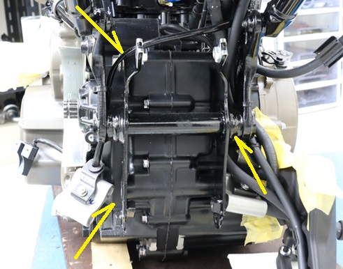後方から見たところです。エンジンをマウントする別体のブラケットが中にいました。このブラケットが、フレームのピボットパイプに