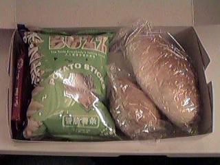 これでもか、と普通のパン1個と甘い菓子パンが3個並んで出てきました。右上の袋の中には骨付き鶏肉が入っていたと思います。