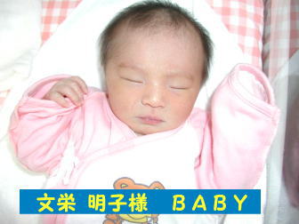 文栄 明子様ベビーの出生記録 ●出生日時 2002.2.4.月曜日 PM8:07 ●出生時体重 2912g ●身長 48.7cm ●性別 女児 |