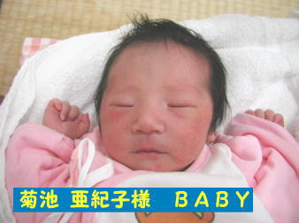 菊池 亜紀子様ベビーの出生記録 ●出生日時 2003.6.12木曜日 AM4:15 ●出生時体重 2960g ●身長 48.0cm ●性別 女児 |