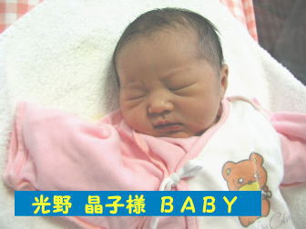 光野 晶子様ベビーの出生記録 ●出生日時 2004.1.8木曜日 AM6:18 ●出生時体重 3148g ●身長 48.0cm ●性別 女児 |