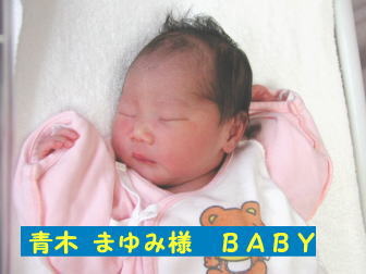 青木 真理子様ベビーの出生記録 ●出生日時 2004.1.10土曜日 AM9:03 ●出生時体重 2960g ●身長 47.0cm ●性別 女児 |