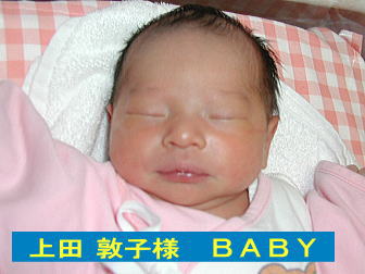 上田 敦子様ベビーの出生記録 ●出生日時 2004.6.23水曜日 AM10:33 ●出生時体重 2778g ●身長 48.0cm ●性別 女児 |