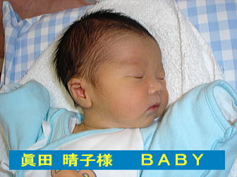 田中 綾子様ベビーの出生記録 ●出生日時 2004.10.29金曜日 PM8:15 ●出生時体重 3434g ●身長 50.2cm ●性別 男児 |
