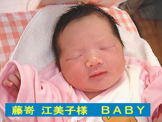 加藤 文枝様ベビーの出生記録 ●出生日時 2005.8.21日曜日 AM1:27 ●出生時体重 3092g ●身長 50.0cm ●性別 女児 |