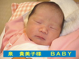 泉 貴美子様ベビーの出生記録 ●出生日時 2005.8.10水曜日 AM2:00 ●出生時体重 2880g ●身長 47.5cm ●性別 女児 |
