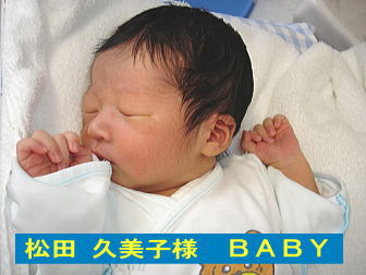 松田 久美子様ベビーの出生記録 ●出生日時 2006.9.13水曜日 PM3:15 ●出生時体重 3682g ●身長 50.8cm ●性別 男児 |