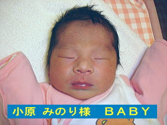 小原 みのり様ベビーの出生記録 ●出生日時 2006.11.20月曜日 AM8:46 ●出生時体重 3094g ●身長 48.0cm ●性別 女児 |