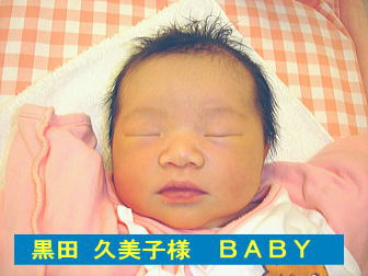 黒田 久美子様ベビーの出生記録 ●出生日時 2006.12.10日曜日 AM4:01 ●出生時体重 2964g ●身長 47.0cm ●性別 女児 |