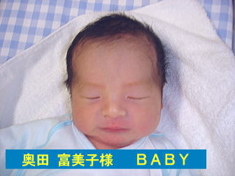 奥田 富美子様ベビーの出生記録 ●出生日時 2007.2.7水曜日 PM2:16 ●出生時体重 2592g ●身長 49.5cm ●性別 男児 |