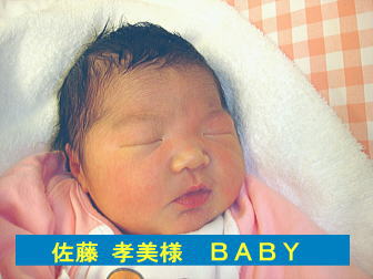 佐藤 孝美様ベビーの出生記録 ●出生日時 2007.2.25日曜日 AM3:12 ●出生時体重 3494g ●身長 50.0cm ●性別 女児 |