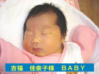 吉福 佳奈子様ベビーの出生記録 ●出生日時 2007.3.17土曜日 PM4:19 ●出生時体重 2996g ●身長 48.0cm ●性別 女児 |