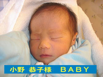 小野 恭子様ベビーの出生記録 ●出生日時 2007.3.20火曜日 PM2:40 ●出生時体重 2210g ●身長 45.4cm ●性別 男児 |