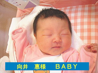 向井 惠様ベビーの出生記録 ●出生日時 2007.3.25日曜日 PM5:03 ●出生時体重 3314g ●身長 51.0cm ●性別 女児 |