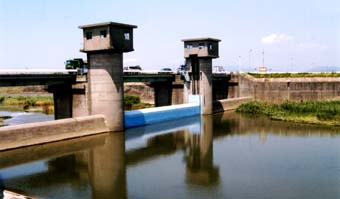 分流堰の水門。 水量調整はここで行う。 水門を通った水は真っ直ぐ三河湾に流れる、放水路だ。 |