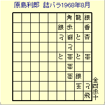 22と、同玉、21と、12玉、22と、同玉、31角成、12玉、 最後は21玉、22角成(と)も同手数で正解です。 作者「昔発表したくる展No.250のはがし送りですが、ほぼ同一プロットの先行作があり (原島利郎氏作、詰パラ1968/8)気になっていたため改良した図です。 旧図の12手サイクルを2手伸ばしただけでやや代わり映えしない印象かも知れませんが、最後は馬もはがしてすっきり捌ける収束になったと思います。 6手目26同桂のやや長い変化は、例によって読み飛ばし希望です。」 本作はと金2枚で追うので、かなりイメージが変わりますね。 それでは、みなさんの感想を。 解答到着順です。