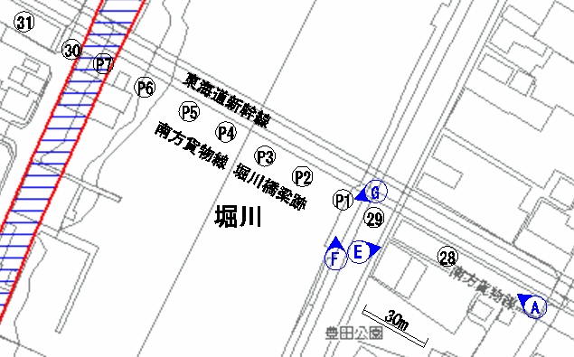 | 28:堀川第2BL 29:不明 P1〜P7:堀川Bv 30:不明 名古屋市年計画図2005年版に管理人が編集 |