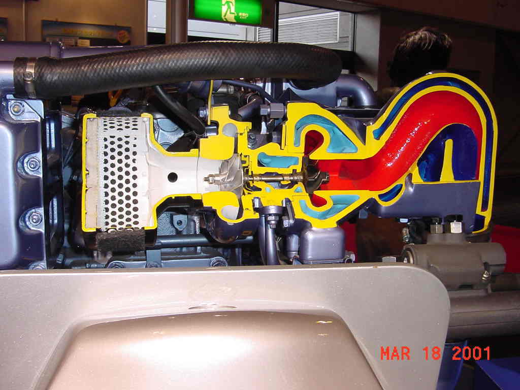 右側の赤色通路から燃焼後の排気ガスが流れ、赤色部分左端にある羽根を高回転でまわします。