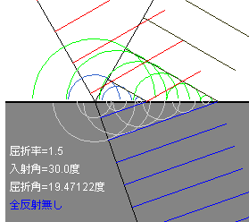 このコーナーでは、反射波,屈折波がつくられていく様子を,ホイヘンスの原理に基づいて模式的に示します。