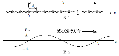 図1のように,質量 $m$ の多数の小球が自然長 $d$ ,ばね定数 $k$ のばねで連結されて $x$ 軸上に並んでいるとする。これを,小球群列と呼ぶこととする。