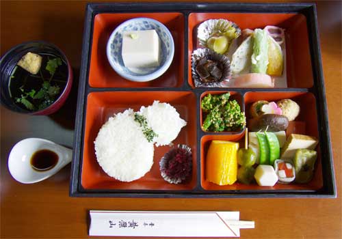 かなり手の込んだ料理であることが、一目でわかる。 精進料理なので肉類はないが、植物性油がふんだんに使われているようで、 和風の精進料理とは違う味わいだ。 すべてが中国風の萬福寺にあって、日本風の松花弁当式の器に盛られ、 割り箸が添えられている。 食事が用意された部屋は、畳敷きの和室にテーブルと椅子であった。 係りの人の応対も大変丁寧で、気持ちよく食事ができたことを付け加えておく。 2013/2/11撮影 |