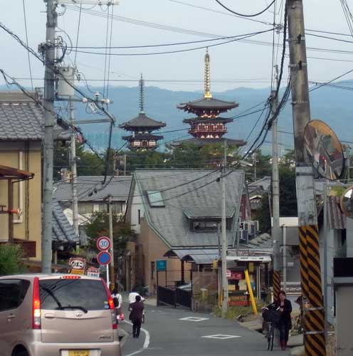 大池越しの薬師寺伽藍の眺めは有名である。 薬師寺のパンフレットの表紙(2011年当時)にも採用されているので、 実物を見たくなり、この日の奈良見学(薬師寺、唐招提寺、興福寺)の帰り道に 再度、西ノ京駅に降り立ち、大池まで足を延ばした。 一通り写真を撮ったあと、駅に向かって歩いていると、道路の正面に東塔と西塔が見えていた。 大池越しに見ると、左に西塔があるのだが、この写真の場所からはそれが入れ代わり、西塔は右側に見えている。 少し、電柱や電線がうるさいけれど、塔のある風景は古都らしくていい。 2つの塔は、微妙に姿が異なる。 最上部の屋根の傾斜もその一つ。 こうやって少し離れた位置から見ると違いがはっきりとわかる。 2010/10/22撮影 |