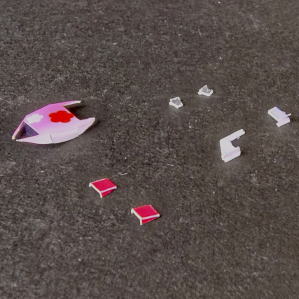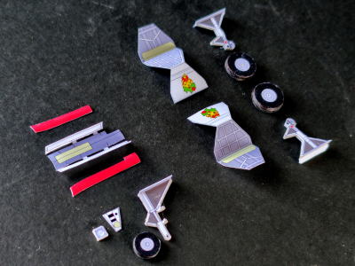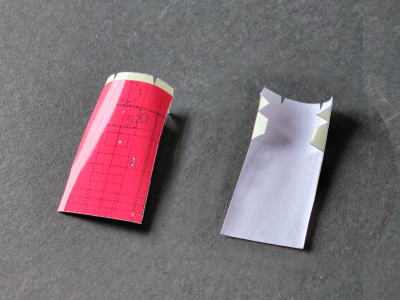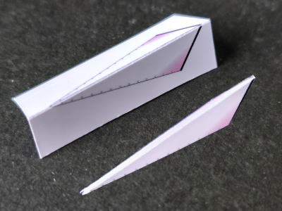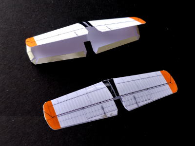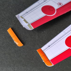 14.垂直尾翼、フィンを切り出して組み立てます。フィンは余白を残した状態で折り曲げ線に沿って浅くカッターを入れて折り曲げてから、