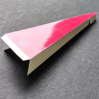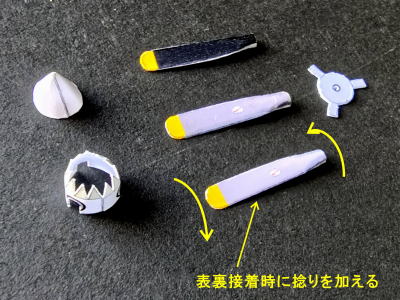その際、図示のの箇所は丸めず平面のままとします。尾翼を取り付けるノリシロは90度に山折りします。
