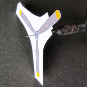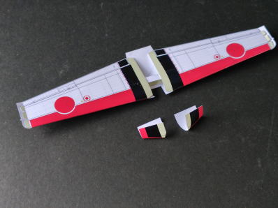 8.主翼フレームを切り出し、ノリシロ部を直角に折り曲げます。主翼フレームを主翼の中央に取り付けます。