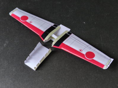 13.水平尾翼を切り出して組み立てます。水平尾翼を胴体に取り付けます。傾かないように注意します。