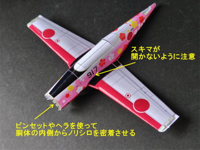 ノリシロを密着させます。モデルを真上から見て、胴体と主翼の取付が直角になっていることを確認します。