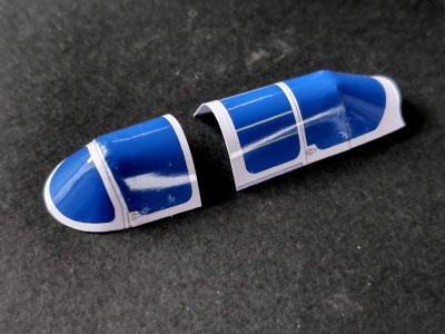 16.風防を切り出して組み立てます。風防を胴体に取り付けます。風防の後半部を先に取り付けてください。
