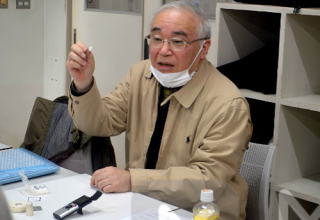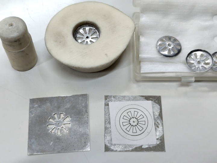 (自作の凹と凸のプレス型を手に取りながら) こういうのからこう削って、孔を開けて、それでもってこれでグリグリやって三つ作りました。四つありますが細かい所が切れちゃいましたが、一応四つは揃っています。一カ月掛かりました。