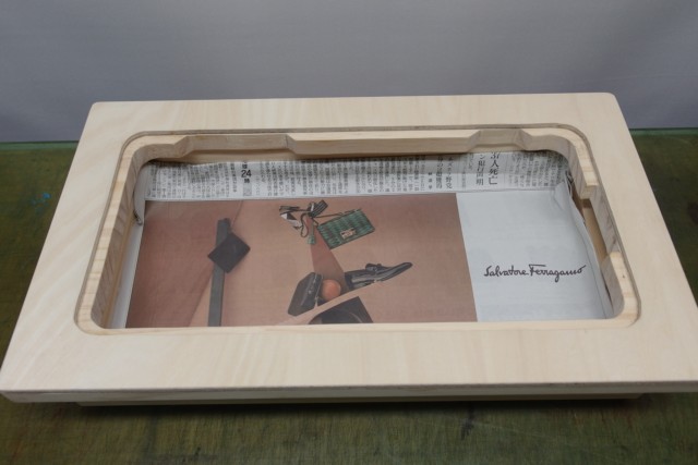 底板は一般的なベニヤ板ではなくて、樹脂板を使っています。台の中に新聞紙を入れて、それが落ちないようにするということだけが目的の底板です。取り付けと交換が楽な形にしました。ミシンの手入れをしていると、オイルをけっこう使います。そのオイルが、ミシンから下に垂れ落ちてしまうことがあるので、新聞紙を入れておくと、始末が楽なのでおすすめです。
